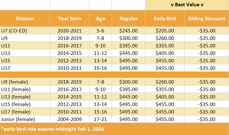 Register before January 25th to secure early bird pricing, and don’t forget to take advantage of the sibling discount when registering 2 or more players!!
